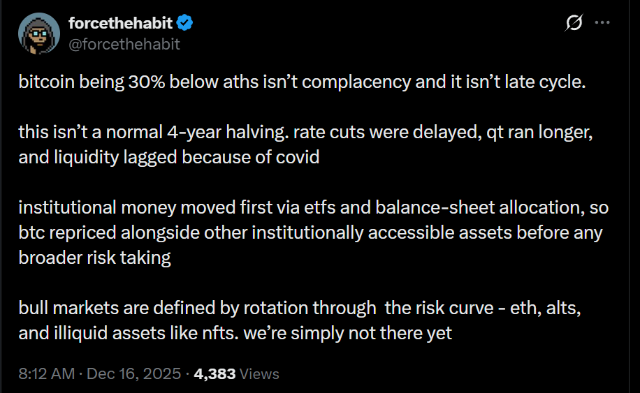 According to X user ‘forcethehabit’, Bitcoin’s decrease does not represent a pattern modification, as rate of interest cuts have actually been postponed and the United States Federal Reserve (Fed) has actually decreased its balance sheet for longer than anticipated. The analysis likewise keeps in mind that institutional capital gotten in mainly through ETFs and business reserves, while rotation into riskier and more illiquid properties has yet to emerge.