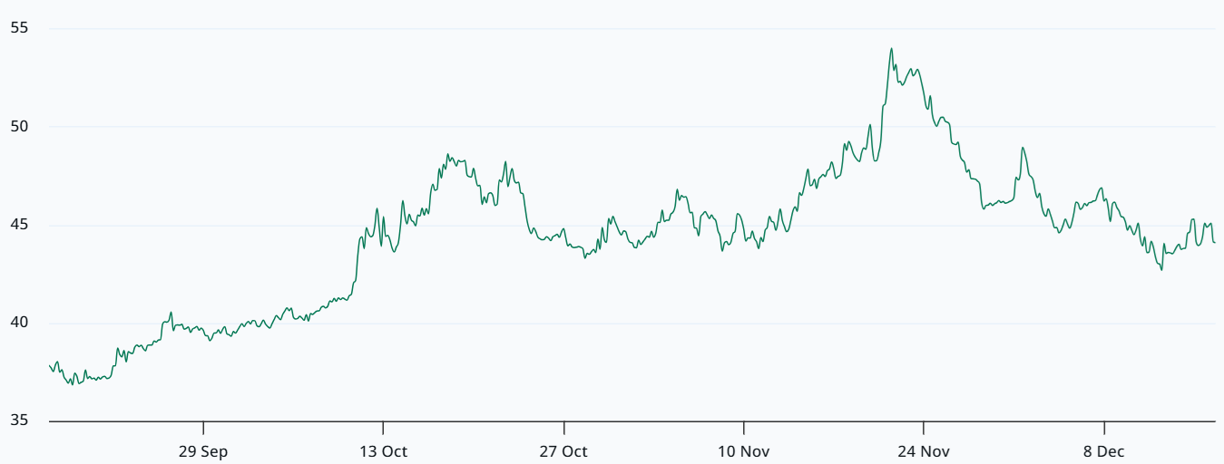 Bitcoin choices’ indicated volatility peaked at 53% in November, approximately in line with the existing level for Tesla (TSLA United States). When traders prepare for sharp rate swings, this metric increases to show the greater premiums charged on call (buy) and put (sell) choices. Market makers tend to decrease threat direct exposure when surprise rate relocations are most likely; nevertheless, this does not always indicate financiers have actually turned bearish.