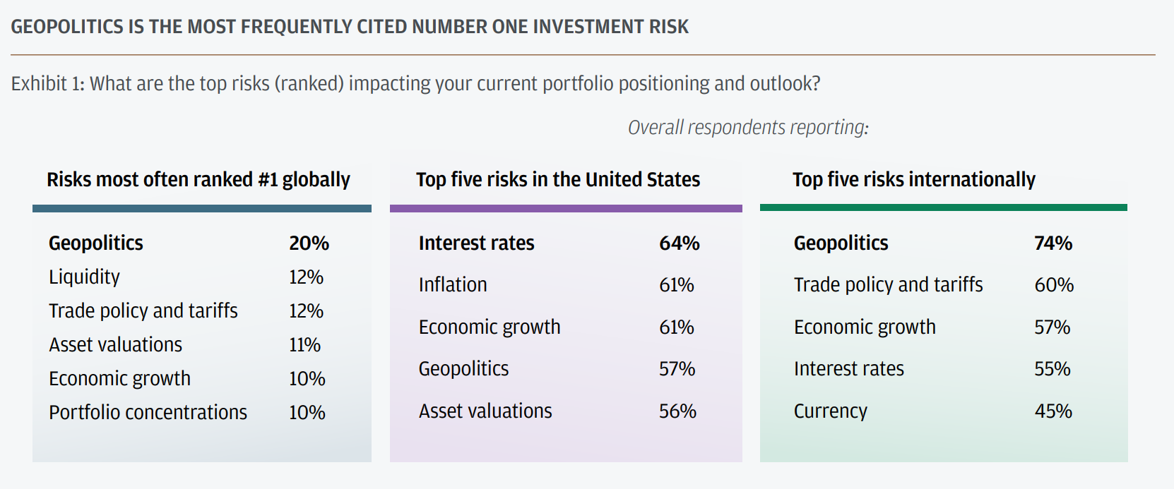 Geopolitics is the leading threat for household workplaces worldwide, mentioned by 20% as their primary issue, followed by liquidity and trade policy at 12% each. Property assessments, financial development and portfolio concentration path close behind.