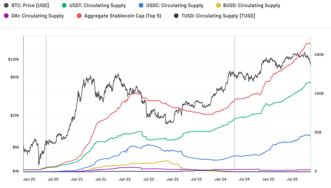 Stablecoins are now moving approximately $225 billion in worth each day, according to the 30-day moving average of aggregate transfer volume for the leading 5 stablecoins determined by Glassnode.