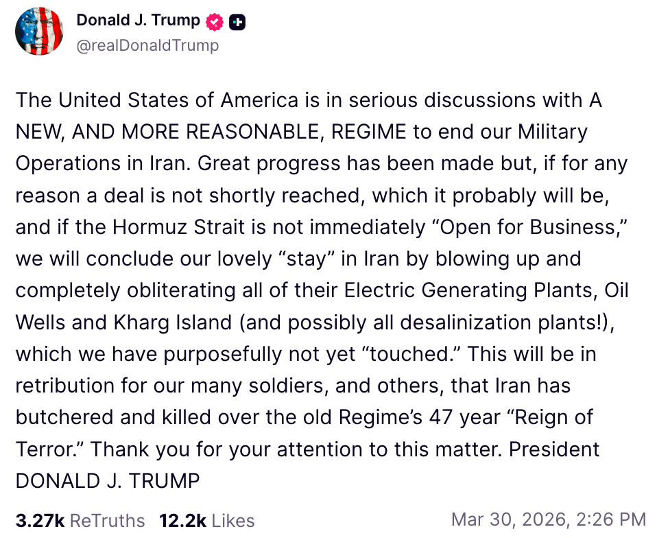 In a post on Truth Social, Trump demanded that Hormuz be “immediately ‘Open for Business’” while threatening renewed attacks on Iranian energy infrastructure.