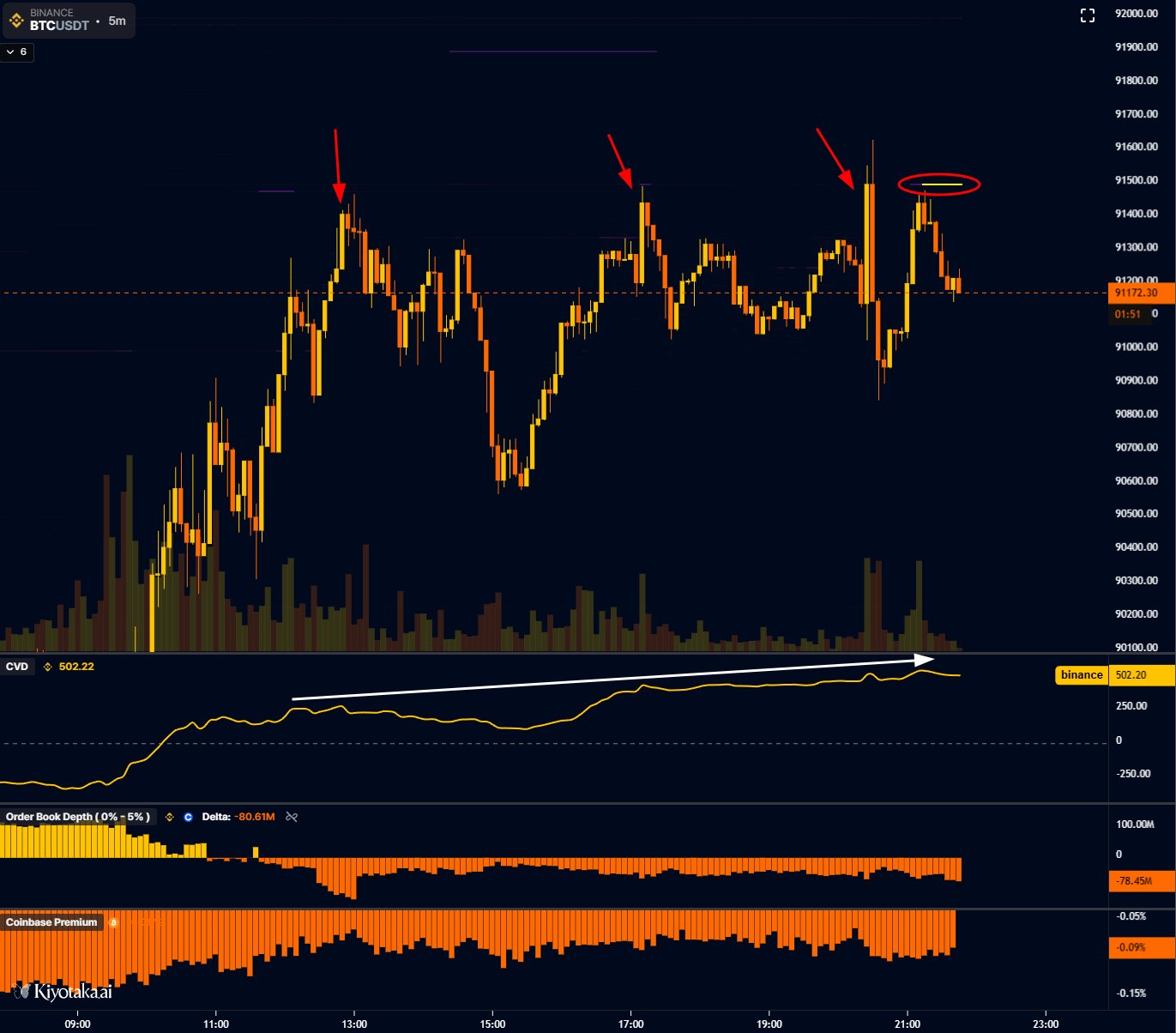 Evaluating exchange order-book habits on the day, trader Alter flagged a passive seller active at $91,500, keeping cost reduced.