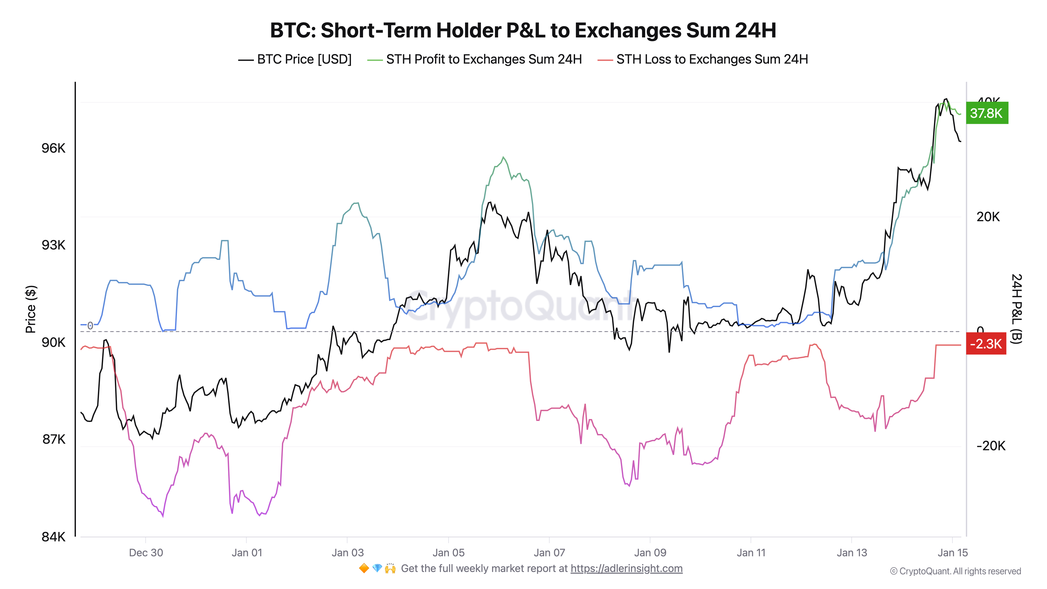 As price hit two-month highs, short-term holders (STHs) — entities hodling for up to six months — sent 40,000 BTC to exchanges over a 24-hour period.