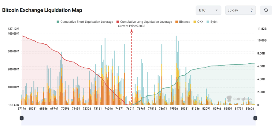 With the assistance level developed at $75,000, the derivatives information details a tight liquidity passage. Cumulative long liquidation threat nears $74,000, with approximately $2.69 billion at threat, while brief liquidations near $80,000 overall about $4.48 billion.