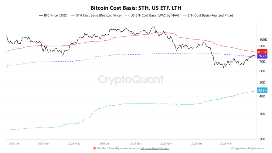 Bitcoin (BTC) is trading at $76,350, which is above a number of crucial financiers’ cost-basis levels. The one-to-three-month holder typical sits at $75,620, positioning a big share of current purchasers near breakeven, while the cost sits simply listed below the United States area exchange-traded fund (ETF) expense basis of $76,700.