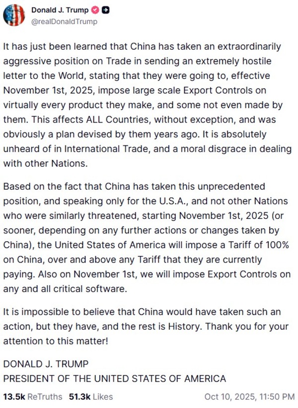 October: Trump threatens 100% tariffs on China