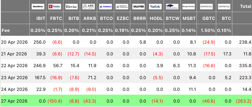 Bitcoin ETFs saw $263 million in net outflows on Monday, marking the very first outflows given that mid-April, according to SoSoValue information.