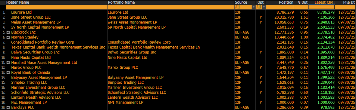 Beyond Laurore and Jane Street, a number of organizations made considerable relocations with IBIT in Q4 2025. Weiss Property Management apparently included approximately 2.8 million shares ($ 107.5 million), while 59 North Capital increased its position by 2.6 million shares ($ 99.8 million).