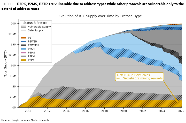 Bernstein thinks particular Bitcoin address types– particularly pay-to-public-key (P2PK), pay-to-multisig (P2MS) and pay-to-Taproot (P2TR)– are amongst the most susceptible to quantum threats.