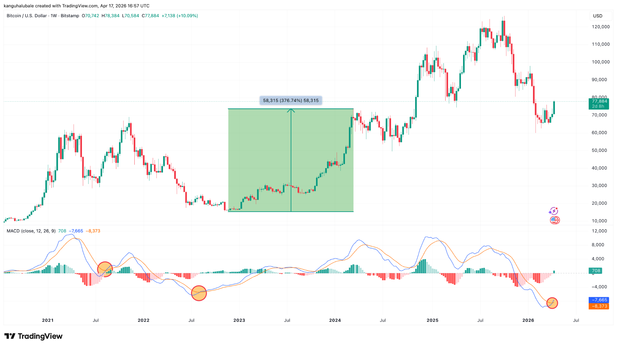 Previous circumstances reveal that Bitcoin tends to increase dramatically when the MACD line (blue) crosses above the signal line (orange). The last time this occurred was at the bottom of the 2022 bearish market, which preceded a 376% boost in BTC rate.