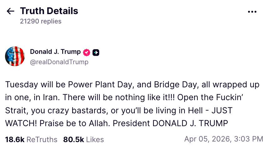 In a post on Reality Social at the weekend, Trump appeared especially restless, calling the day of the due date “Power Plant Day” and “Bridge Day” while requiring that Hormuz resume.