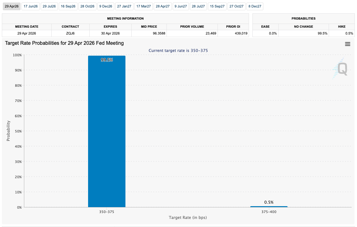 Fed target rate likelihoods for April FOMC conference (screenshot). Source: CME Group