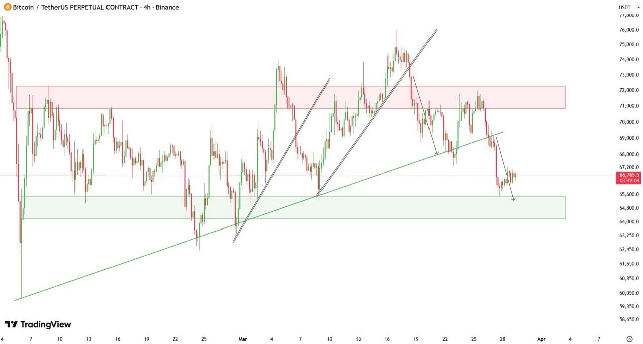 ” BTC is revealing a clear shift in structure on the 4H, with cost forming lower highs and losing the 68– 69k assistance, which now functions as resistance; this validates short-term bearish momentum, and unless cost rapidly recovers 69– 70k, the course of least resistance stays down towards the 65k need zone.”