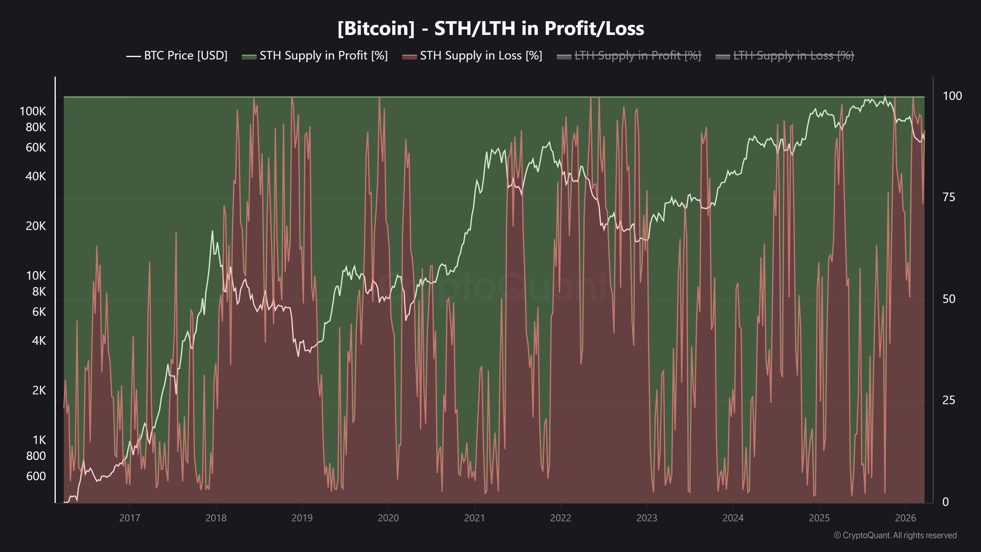 Recently, CryptoQuant computed STH share of the total supply at 5.7 million BTC, with 92% resting on losses.