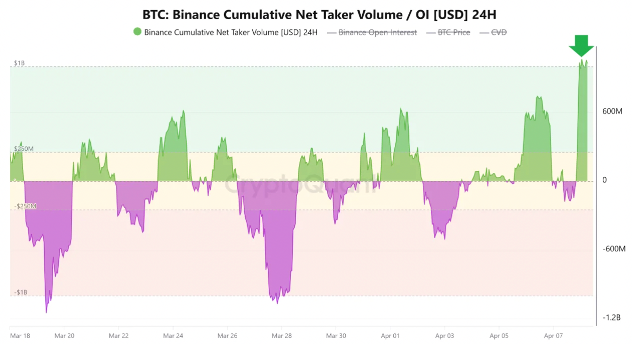 The Binance Bitcoin cumulative test taker volume has actually “reached $1.02 billion, its greatest level given that March 17, signifying a sharp return of aggressive purchasing in Bitcoin,” CryptoQuant expert Amr Taha stated, including: