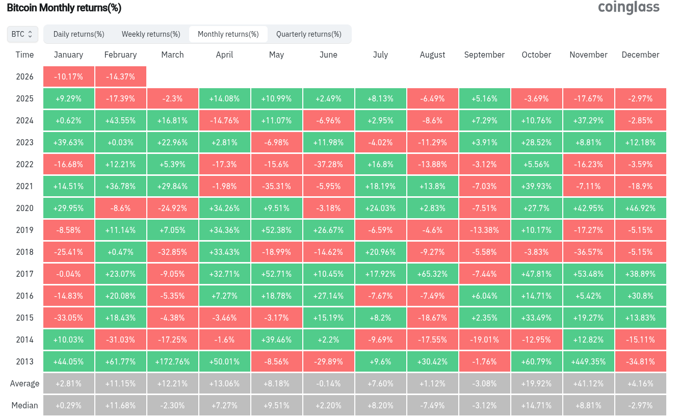 Data from monitoring resource CoinGlass shows that at -14.4%, Bitcoin’s February losses in 2026 are almost on par with last year’s performance. Still, since 2013, February has only ended in the red three times.