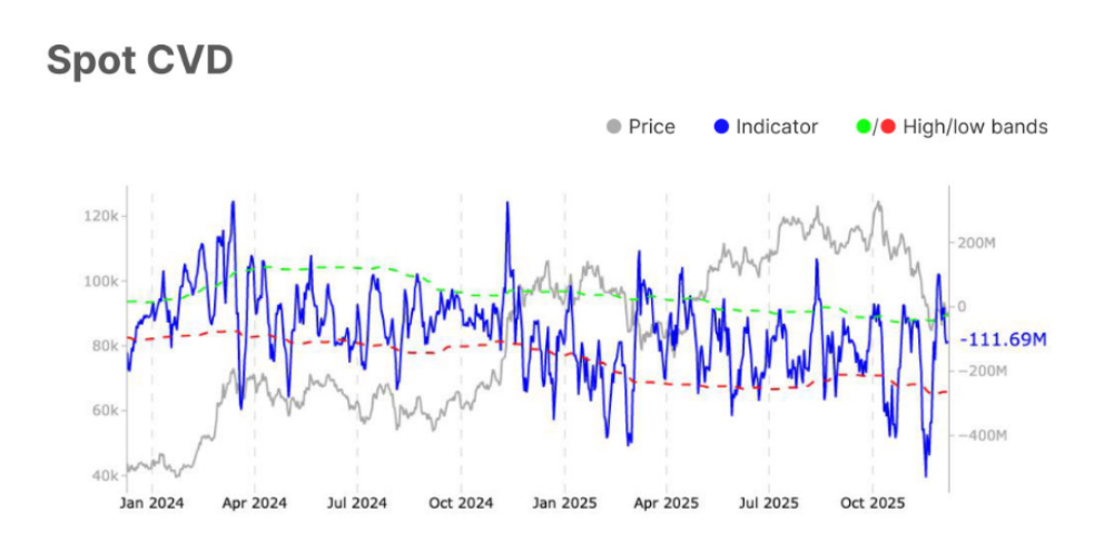 Bitcoin’s area cumulative volume delta (CVD), a sign that determines the net distinction in between purchasing and offering trade volumes, reveals net area purchasing on exchanges stays unfavorable even after Bitcoin’s current rebound.