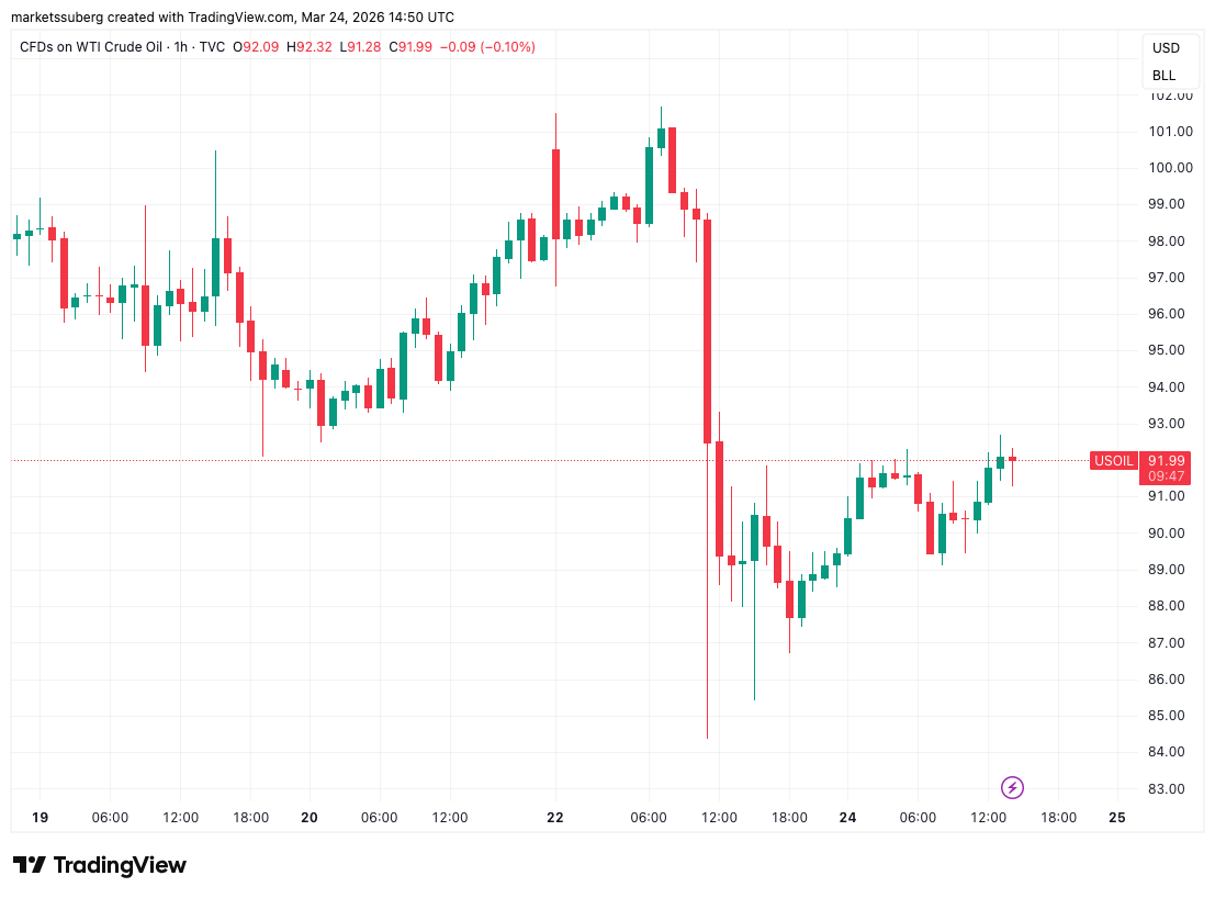 US stocks opened down on the day, with the Nasdaq Composite Index losing nearly 1%, while gold failed to pass $4,450. Oil inched toward $95 per barrel after an initial drop to start the week on the back of Iran peace rumors.