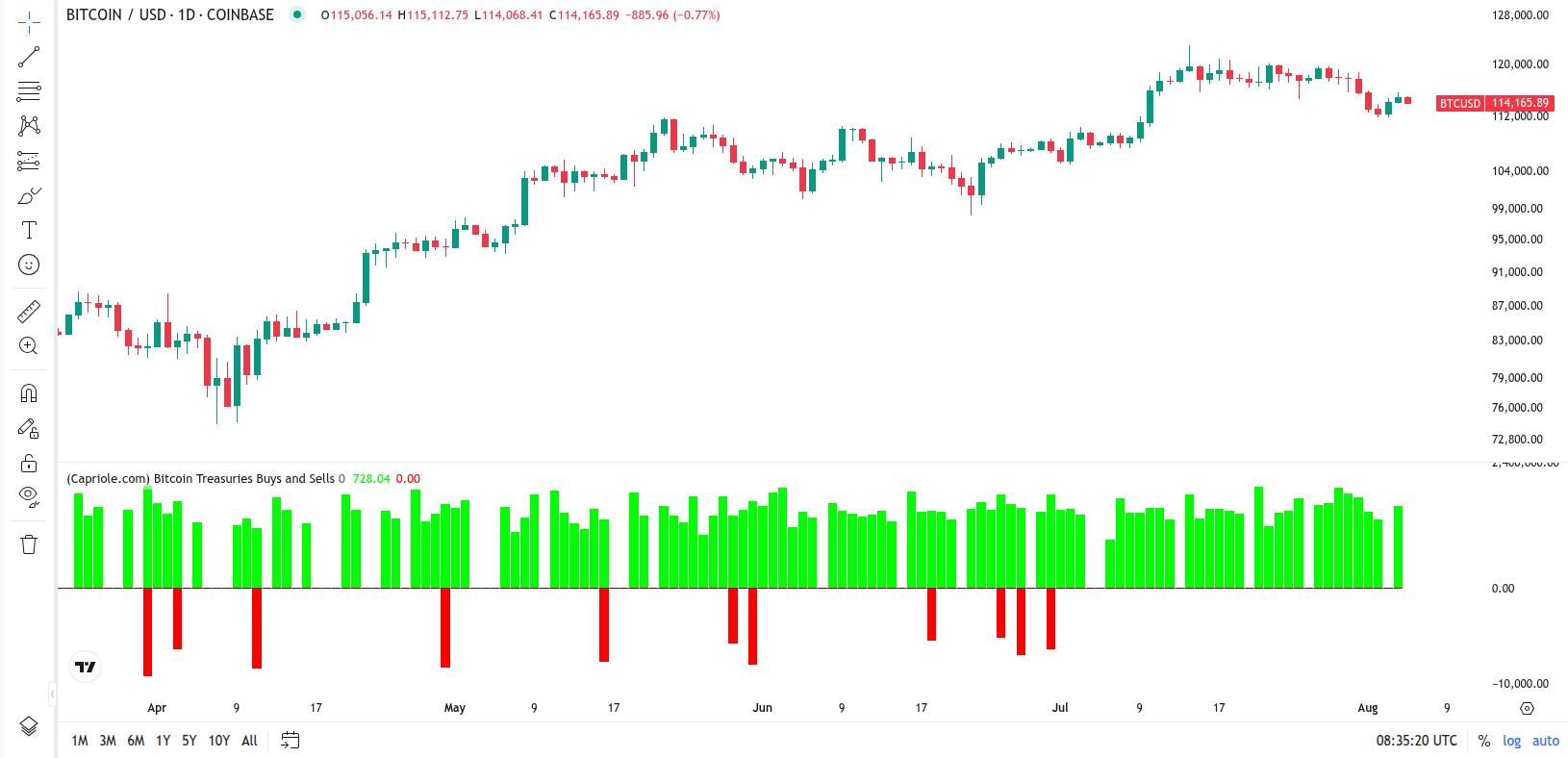 Capriole information reveals that on Monday, business Bitcoin treasuries included about 630 BTC ($ 72 million).
