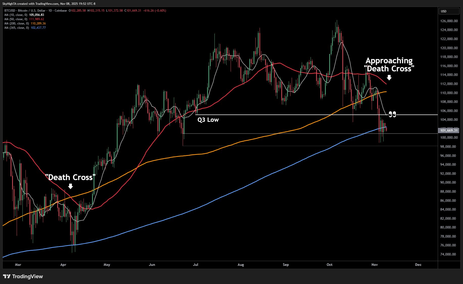 ” The fourth ‘death cross’ of the bull cycle is approaching. Each time we have actually seen reversion to the mean and a continual bottom,” he informed X fans on the day.
