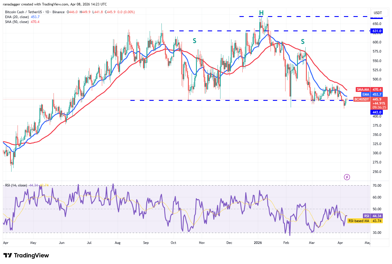 Purchasers are trying to sustain Bitcoin Money (BCH) above the breakdown level of $443 however are anticipated to deal with substantial resistance from the bears.