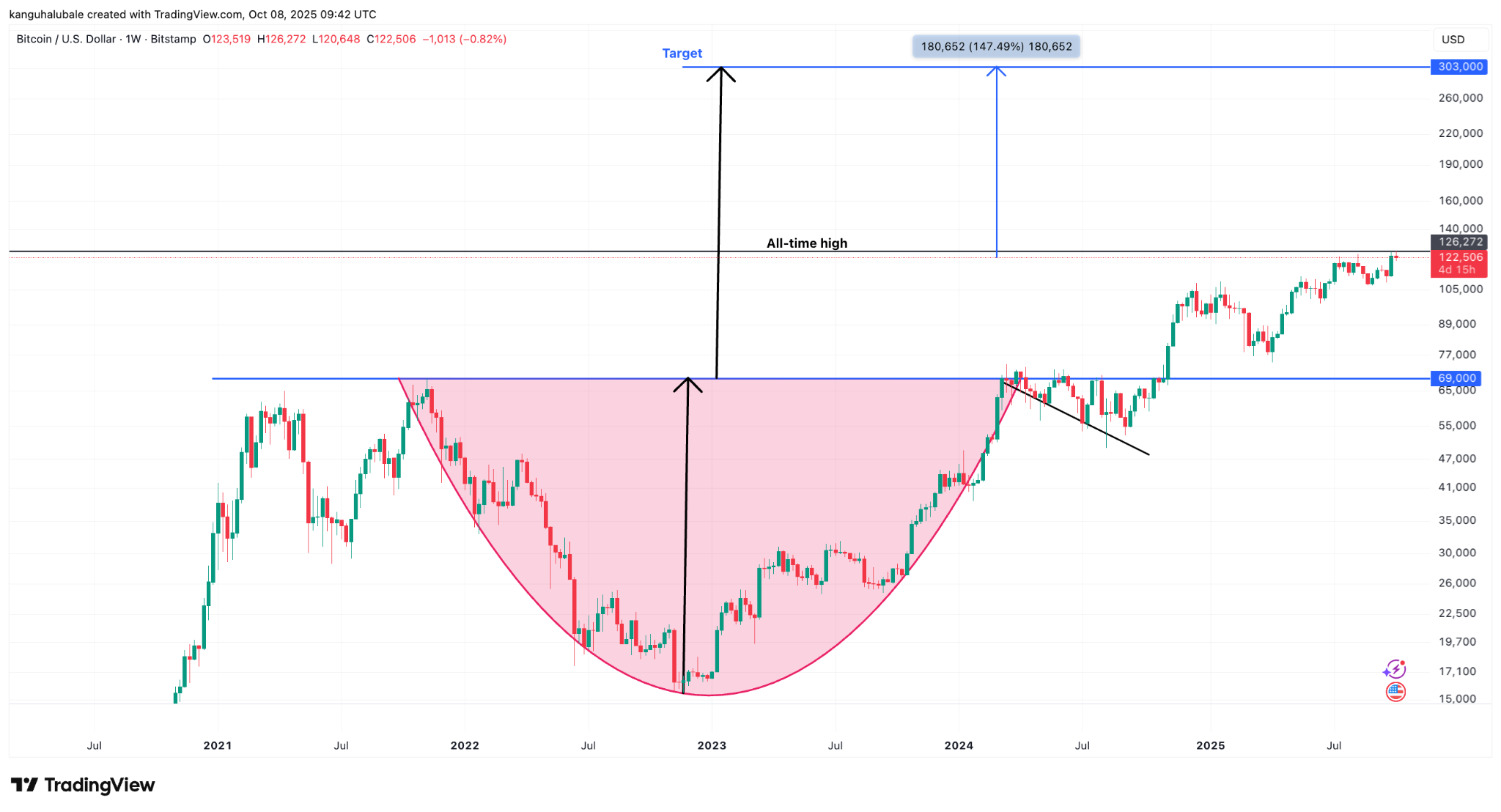 That puts Bitcoin’s cup-and-handle breakout target for 2025– 2026 at around $303,000, according to chartist Gert van Lagen.