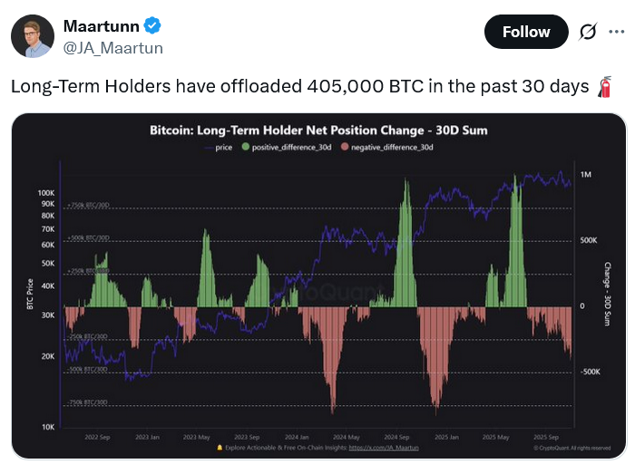 Information from CryptoQuant likewise reveals that long-lasting holders unloaded 405,000 Bitcoin from about Oct. 2 to Nov. 2.