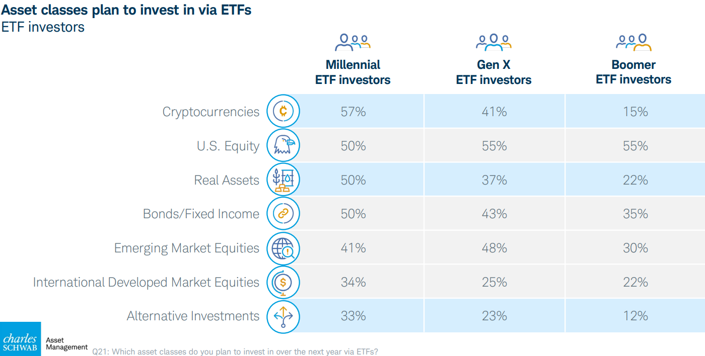 In its ETFs and Beyond report launched on Thursday, Schwab discovered that 52% of participants to its study were preparing to buy a United States equities-tracking ETF, while 45% stated they had an interest in crypto ETFs, incorporated 2nd location with those who had an interest in funds tracking United States bonds.