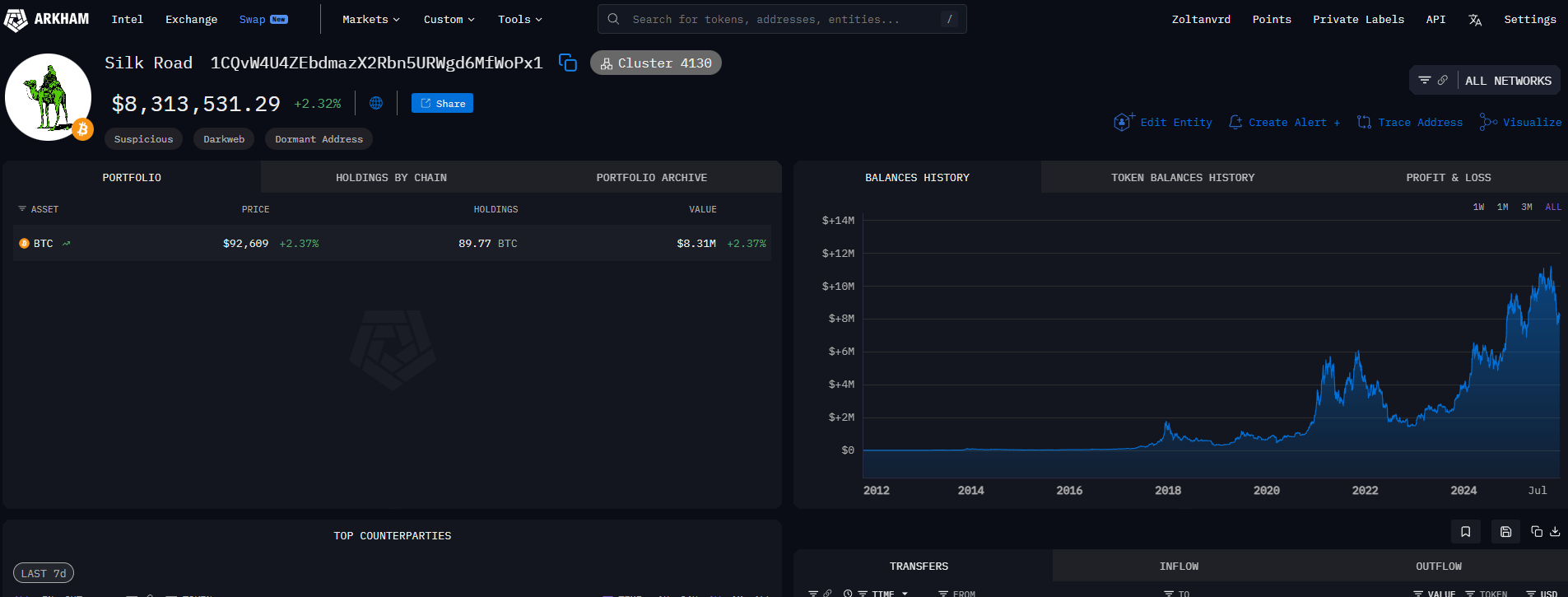 Another Silk Road-tagged wallet most likely coming from Ulbricht holds $8.3 million in Bitcoin. Disallowing 3 little test deals in the previous 10 months, the wallet has actually been non-active for 14 years, according to Arkham.