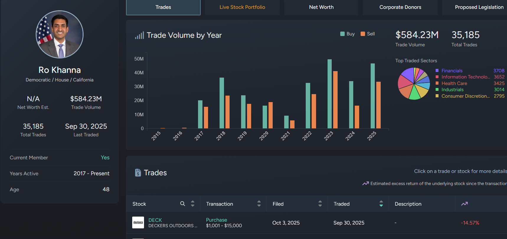 According to information from Quiver Quant, Khanna himself has actually notched up $80.3 million worth of stock trade volume in 2025.