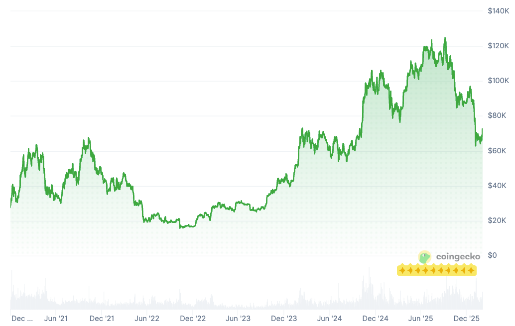 The argument that Bitcoin functions as an inflation hedge has actually compromised just recently as the cryptocurrency’s rate decreased dramatically. Bitcoin has actually fallen about 50% from its October 2025 peak of above $126,000, going back to late-2024 levels and briefly touching lows near $60,000.