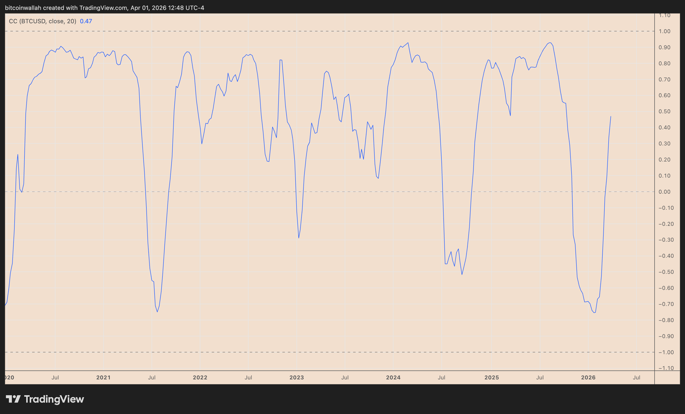 Since Wednesday, the 20-week rolling connection coefficient in between the 2 markets was favorable at 0.47.