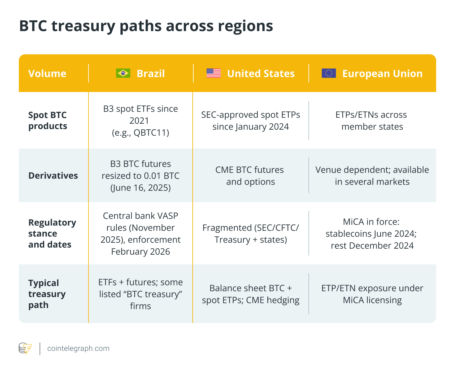 It’s likewise about utilizing familiar pipelines. Area ETFs and noted futures on B3 let treasurers size, rebalance and hedge within the very same governance and audit regimens they utilize for other possessions. The smaller sized 0.01-BTC futures agreement makes hedging more exact and less expensive to execute at a treasury scale.