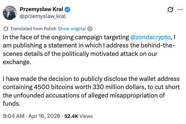 Zonda CEO Przemysław Kral published a video declaration on Thursday revealing the exchange’s wallet address, stating the personal secrets to the wallet were never ever turned over.