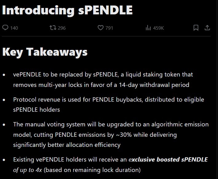 Pendle is likewise simplifying requirements for ballot and prepares to consume to 80% of procedure income for governance benefits and token buybacks.