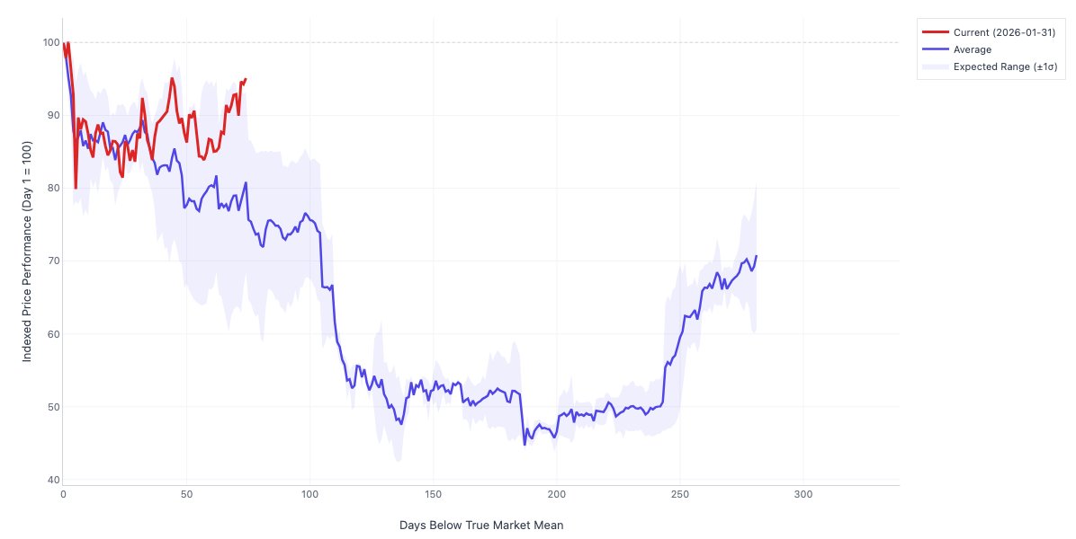 ” That stated, 75 days is still early. The 2018 and 2022 episodes didn’t bottom up until months 5-9,” CryptoVizArt cautioned.