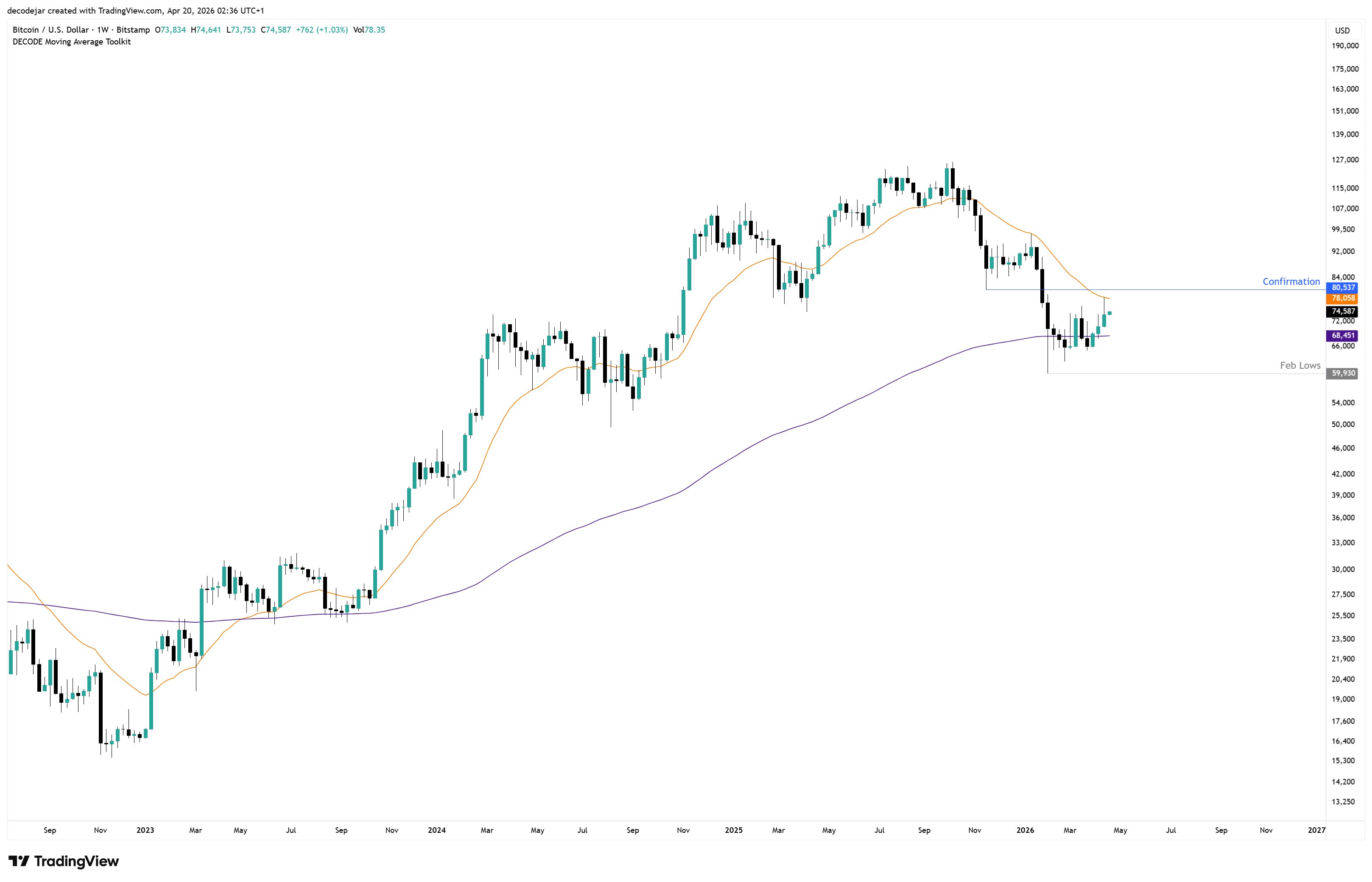 Rate now has several resistance levels overhead, with the nearby being its 21-week rapid moving average (EMA) at $78,400.