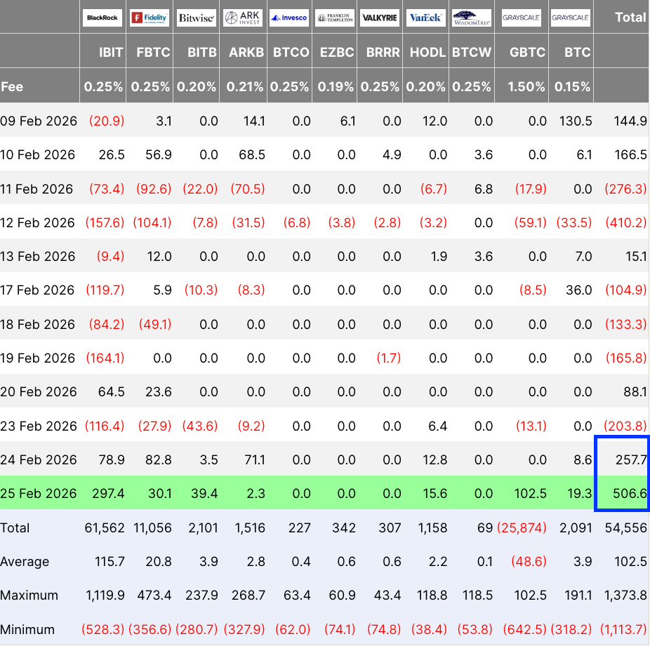 Area Bitcoin ETF inflows drew in half a billion dollars in inflows on Wednesday.