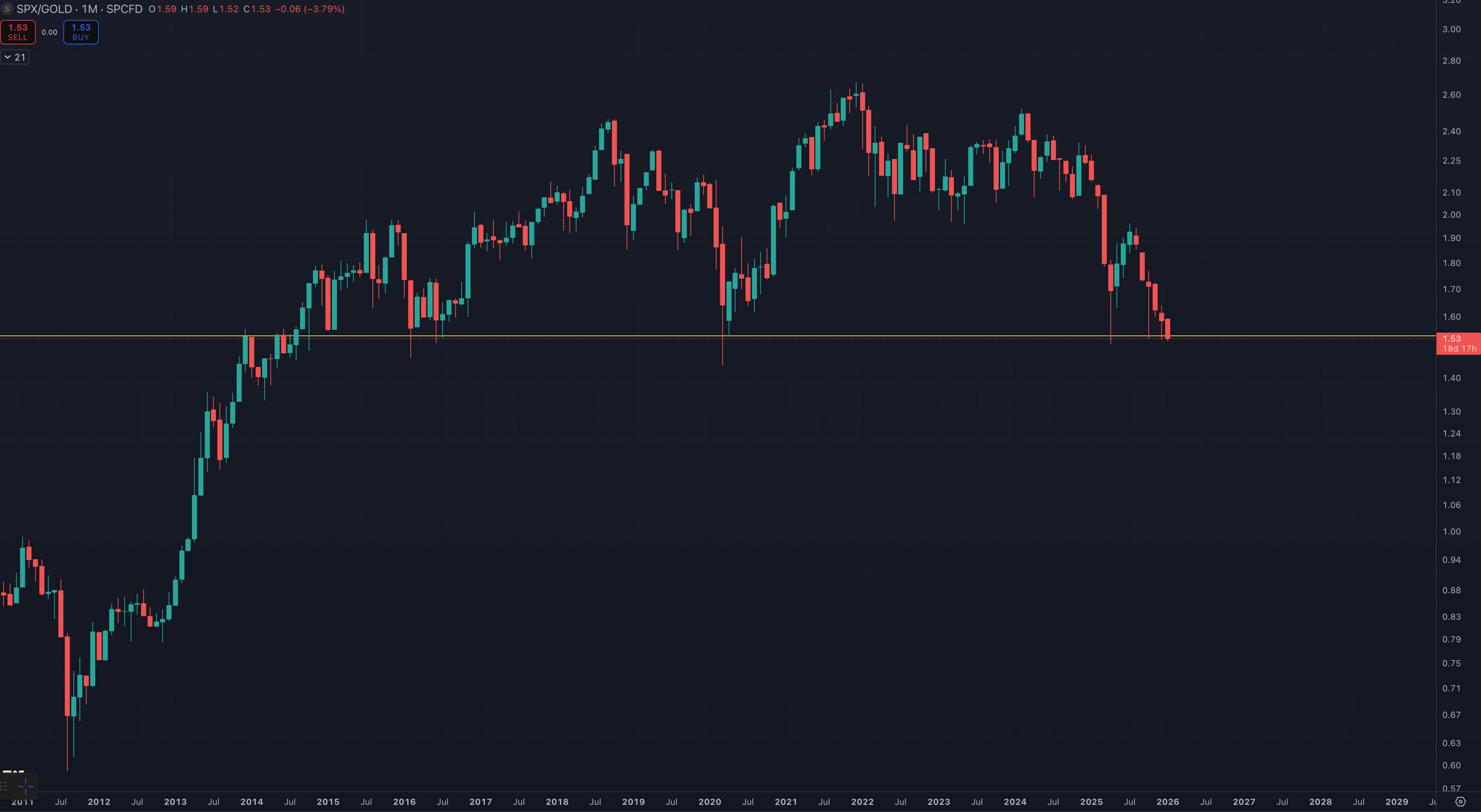 ” If SPX breaks down versus Gold, the environment we have actually discovered ourselves in for the last years will entirely alter,” he argued about the month-to-month chart.
