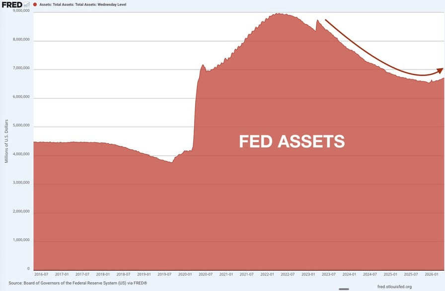 The Fed has actually started contributing to its balance sheet this year– a type of liquidity driver that typically benefits markets.