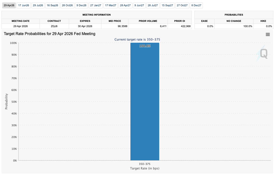 Fed target rate possibilities for April 29 FOMC conference (screenshot). Source: CME Group