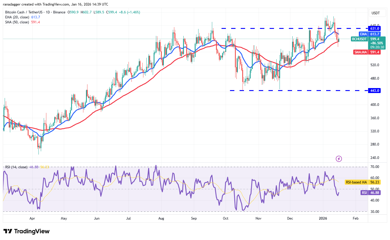 The 20-day EMA ($ 613) has actually begun to decline, and the RSI remains in the unfavorable area, suggesting a minor edge to the sellers. If the rate sustains listed below the 50-day SMA ($ 591), the BCH/USDT set might drop to $563 and after that to $518.