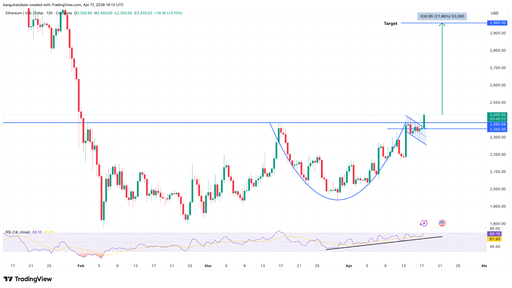 The target is set by including the cup’s depth to the breakout point, which concerns around $2,960, a roughly 22% boost from the present cost.