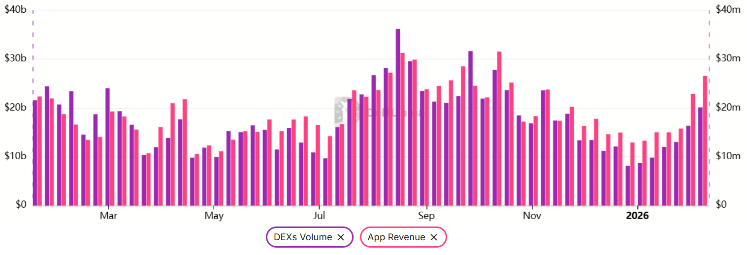 Weekly decentralized exchange volume doubled to $20 billion, narrowing the earnings space with Solana.