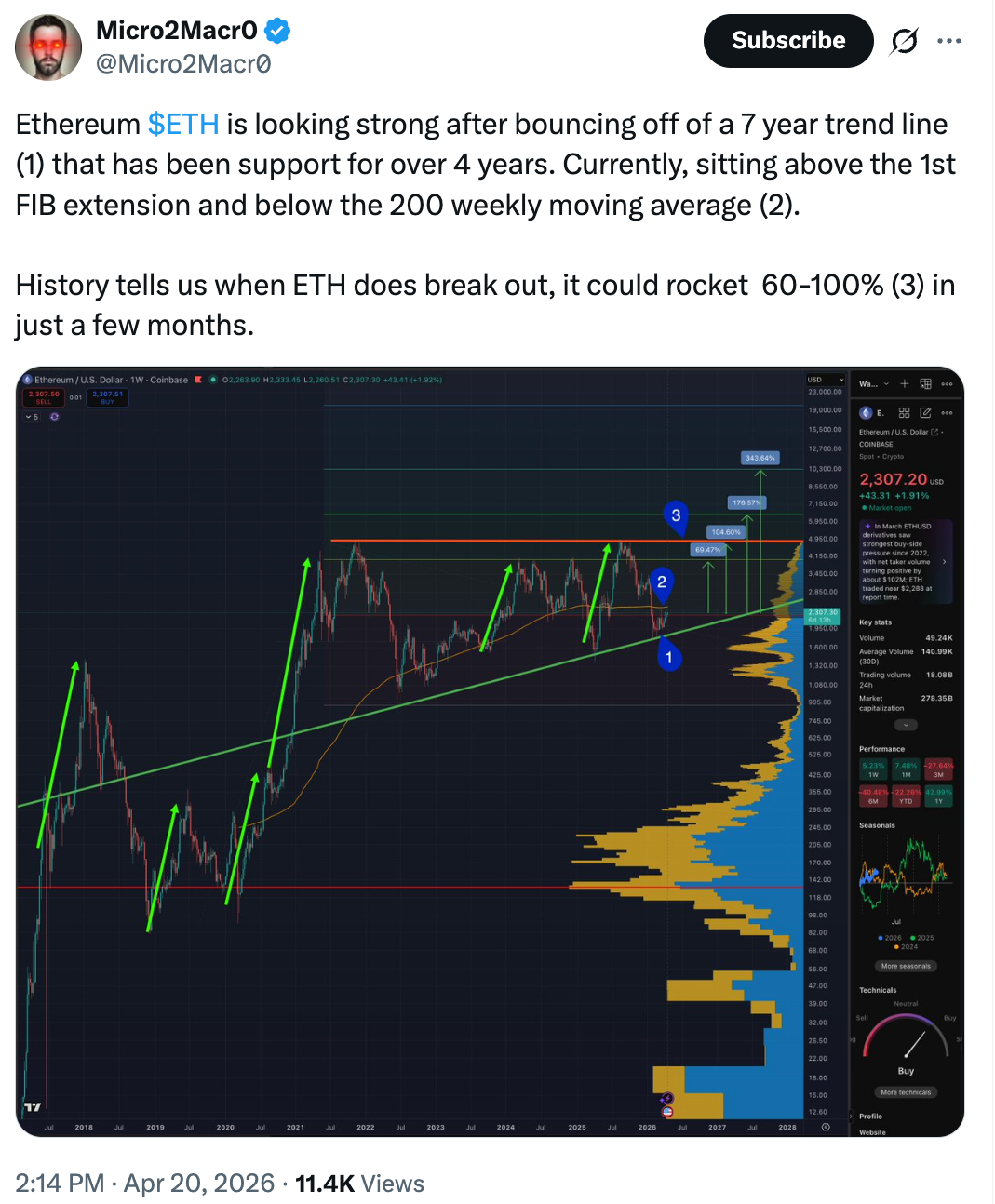 Zooming out, expert Micro2Macr0 stated that a breakout from a multi-year rising triangle might cause a 60%-% 100% ETH rate rally.