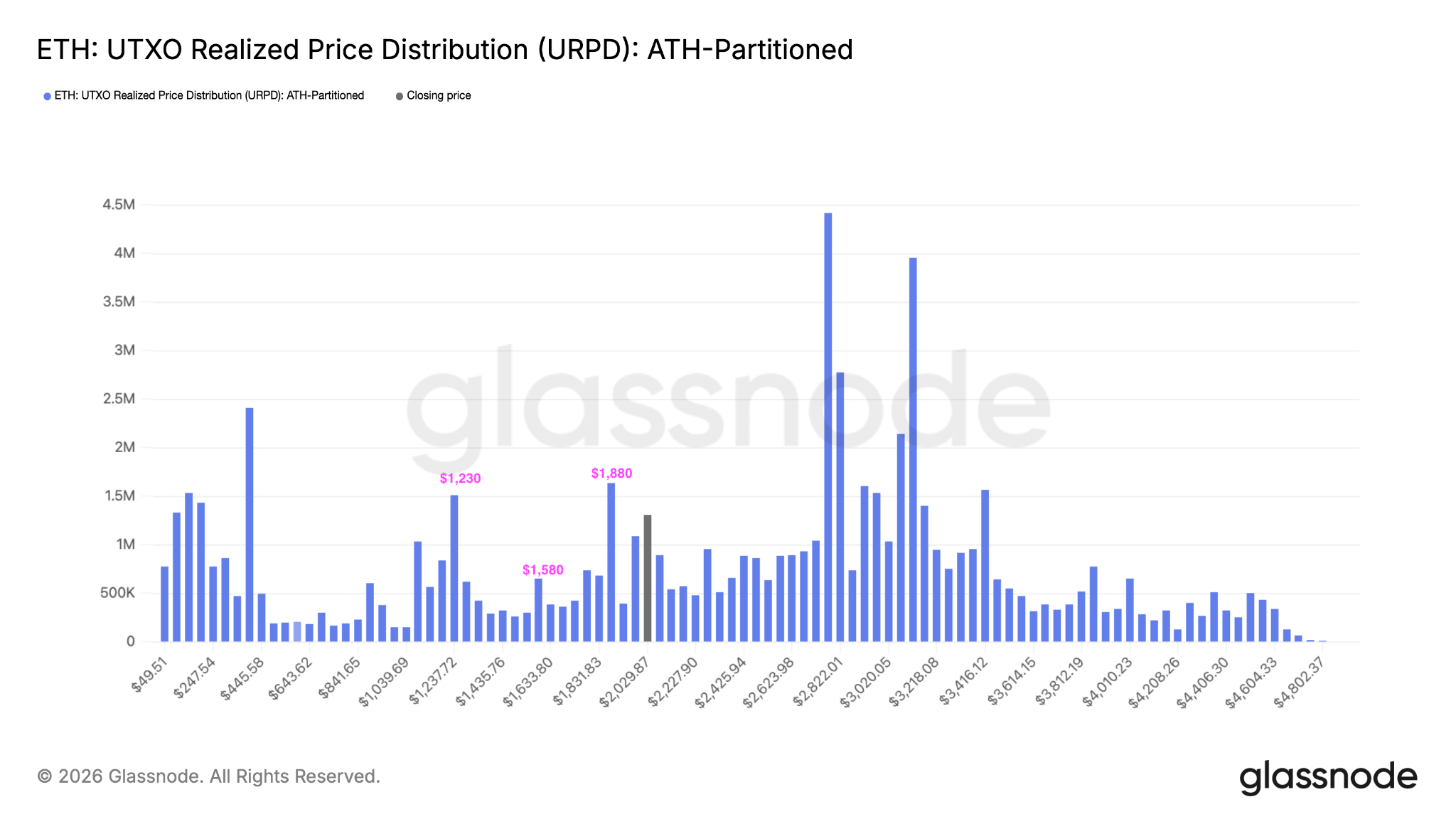 Glassnode’s UTXO recognized cost circulation (URPD), which reveals the typical costs at which ETH holders purchased their coins, exposes that listed below $2,000, essential assistance levels for ETH sit at $1,880, $1,580 and $1,230.