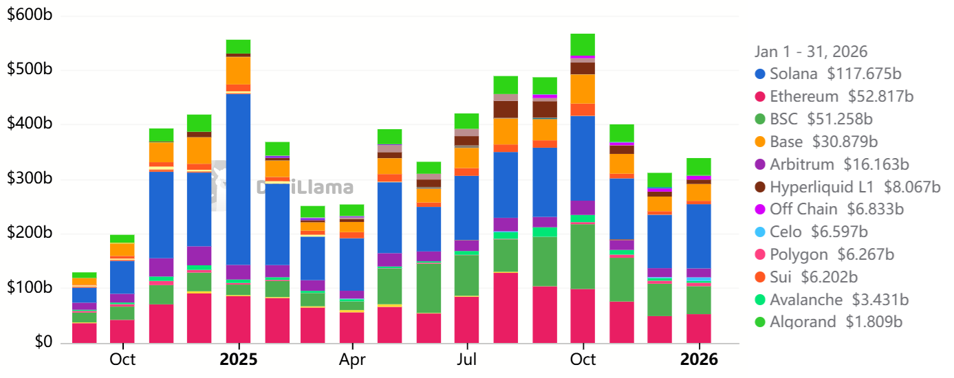 Trading volumes on Ethereum decentralized exchanges (DEX) reached $52.8 billion in January, a sharp drop from $98.9 billion in October 2025. This 47% decrease in activity decreases rewards for holders; generally, high need for blockchain processing activates the network’s burn system, which diminishes the overall ETH supply.