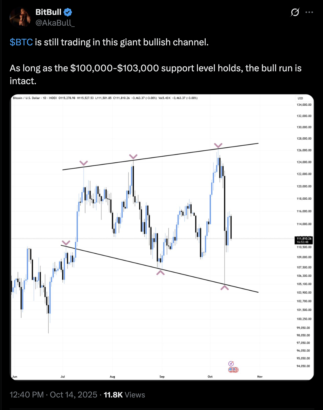 That consists of a “huge bullish channel” highlighted by chartist BitBull, which revealed BTC cost changing inside a widening wedge.