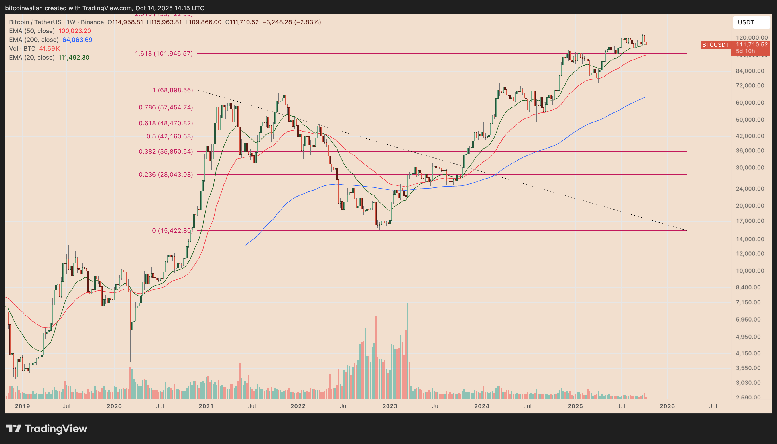 This area likewise lines up with Bitcoin’s 50-week rapid moving average (50-week EMA, represented by the red wave) and the 1.618 Fibonacci retracement line, providing technical weight to it as a prospective target zone.