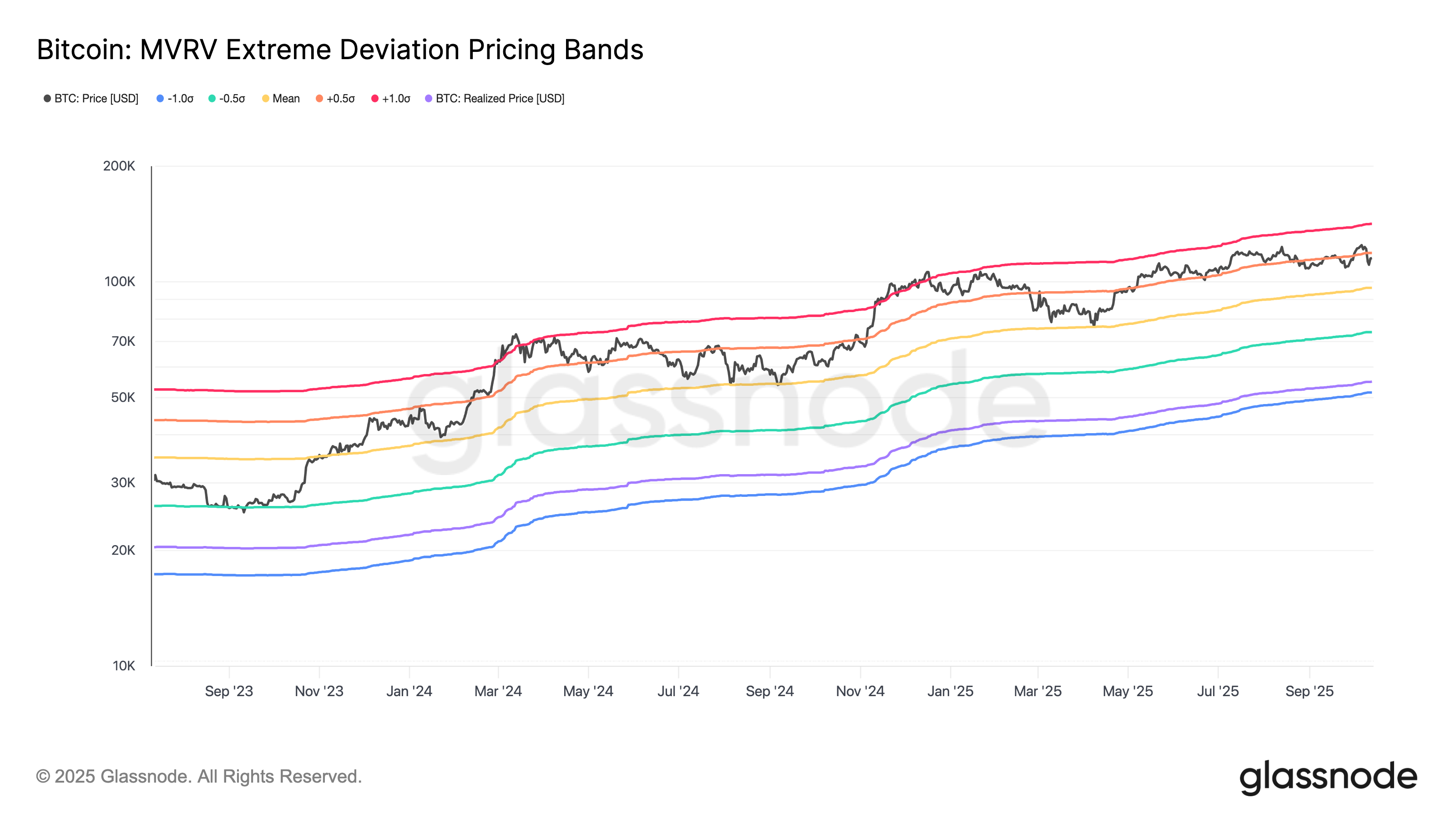 Bitcoin is now trading listed below its +0.5 basic variance band (+0.5 σ band; orange) near $119,000, according to Glassnode’s MVRV Extreme Variance Rates Bands.